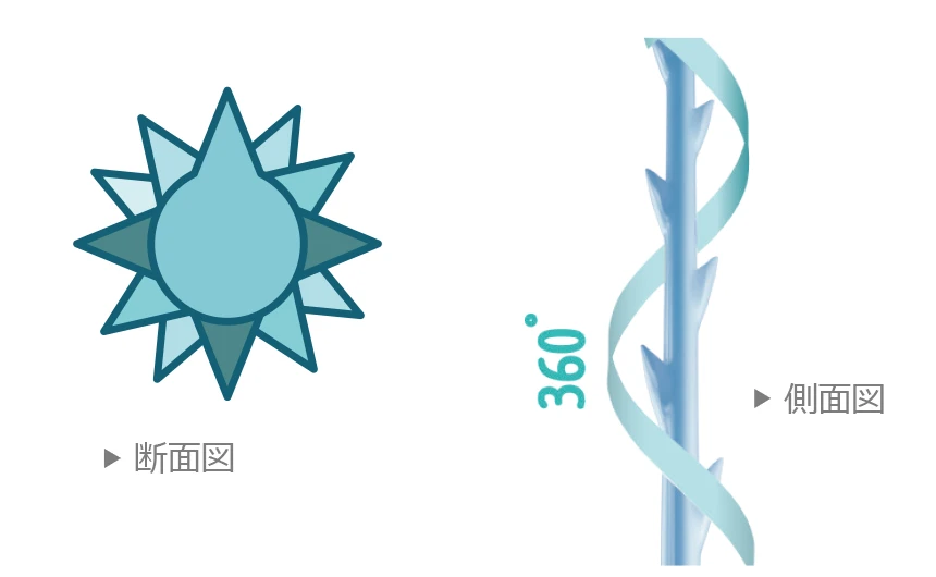 糸全体に360°スパイラル状に配置されたコグ(突起)が、皮膚組織を全方向からしっかりと捉えることで、固定力が高まり、優れたリフトアップ効果を発揮します。