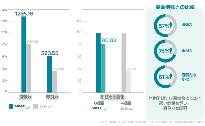 MINT Lift™は、特許取得のモールディング技法とと3D Helical Structureによって、強い引張力と牽引力を実現しています。挿入後の維持力が高く、確かなリフトアップ効果が長期間持続することが確認されています。