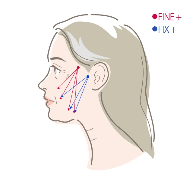ミントリフトは、たるみの程度やフェイスラインの崩れ方に応じて、糸の本数や挿入位置を細かく調整します。同じ「たるみ」でも、原因が“皮膚のゆるみ”か“脂肪の下垂”かによって、引き上げる方向や糸の配置は大きく変わります。